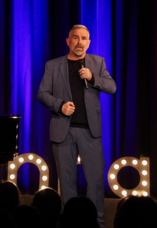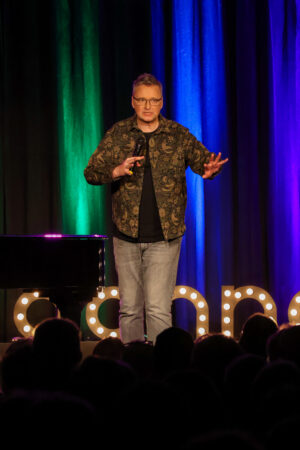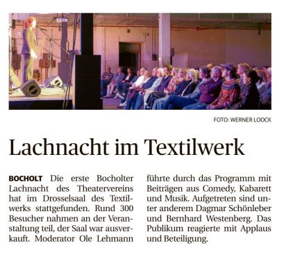Ole Lehmann, der Moderator der Ersten Bocholter Lachnacht des Theatervereins im Drosselsaal des Textilwerks kündigte ein tolles Programm an, alles sei dabei: Comedy, Kabarett, Musik. „Ich sag mal eins, ohne mich zu weit aus dem Fenster zu lehnen, aber die nächsten acht Stunden werden wie im Flug an euch vorbeiziehen“, trotz verschlossener Türen. Ein Scherz! Gelächter und Pfiffe.