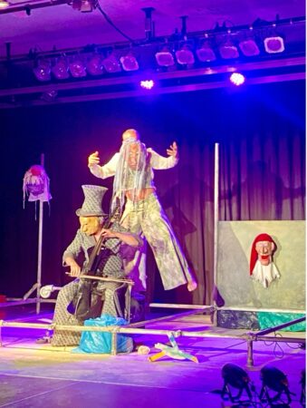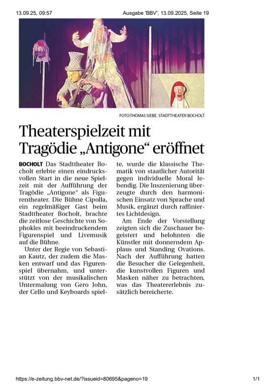 Die Bühne Cipolla, in den letzten Jahren Stammgäste des Stadttheater Bocholt e.V., führt „Antigone“ als Figurentheater mit Livemusik auf. Sebastian Kautz kümmert sich um das Figurenspiel und führt Regie. Diesmal hat er zudem die Masken gebaut. Gero John kümmert sich um die Musik – er komponiert den Soundteppich und spielt Cello sowie Keyboards. Die beiden sind Meister ihres Fachs. Sprache und Musik harmonieren und ergänzen sich vortrefflich. Kautz ist ein virtuoser Spieler und John unterlegt die Szenen je nach Bedarf mit dramatischen oder poetischen Akzenten. Dies alles wurde durch das fein abgestimmte Lichtdesign unterstützt.