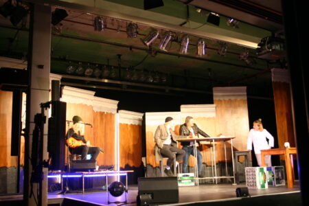 Etwas kurz kam die irrsinnige Gesprächschoreographie, die man aus Regeners Buch kennt und bei der die Protagonisten bisweilen minutenlang herrlich aneinander vorbeireden, so dass man beim Lesen (oder Zuhören) fast den Verstand verliert. Dafür hat die Regie eine bisher unbekannte Figur eingeführt: den Kneipenmusiker Jürgen, der die Spielszenen mit einigen mutwillig verhunzten Coverversionen von Hits der Achtziger anreicherte. Billy Idol erschien da und unvermeidlich: „Time of my Life“ aus Dirty Dancing mit einer unvergleichlich schrägen Tanzeinlage. Die Spielszenen waren umtost von verzerrten Gitarrenakkorden und von reichlich „Alkoholgenuss“ auf der Bühne begleitet. Seit Karl Schmidt wissen wir aber immerhin: Einen Hangover vermeidet man mit segensreichen Elektrolyten – also wurden auf der Bühne unentwegt Kartoffelchips verzehrt. Alles nicht so furchtbar ernst gemeint …