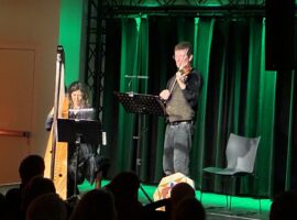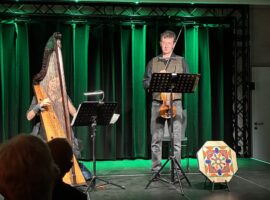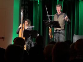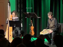 Johanna Seitz, Barockharfe, und Christoph Mayer, Barockvioline, entführten das Publikum in die Welt traditioneller schottischer, englischer und irischer Musik.Bei den melancholischen Liebesliedern und tänzerisch-leichten Stücken entstand ein fein abgestimmter Dialog zwischen Harfe und Violine.
