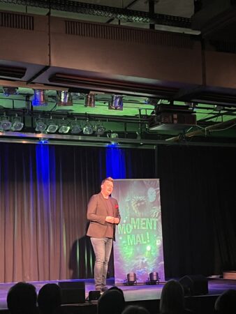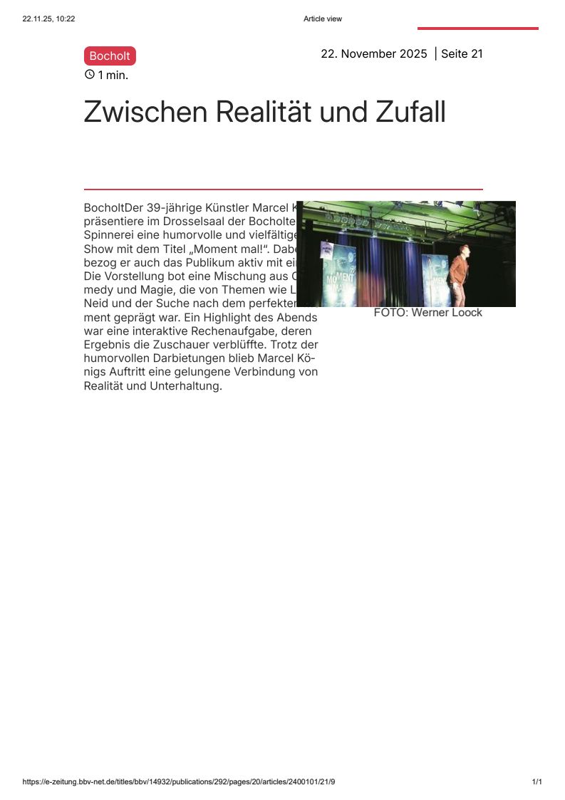 Der 39-jährige aus nördlich von Hamburg freute sich über die Zuschauer der ersten Reihe, ganz besonders über den Herrn ganz rechts aus Dingden, das in Hamburg übrigens ein Riesending sei, obwohl so weit weg von Bocholt und doch alles genau so wie in Bocholt, Währung und alles! Die zehn Kilometer Anreise jedenfalls sei die Show auf jeden Fall wert, so König. Das Gegenteil bei der Handvoll Dortmunder im Publikum, deren sechzig Kilometer Anreise sei die Show im Leben nicht wert. So wurde man eingestimmt. Die Show pendelte von Freud zu Leid, von Liebe zu Neid und von Alt zu Jung im Drosselsaal der Bocholter Spinnerei. Der perfekte Moment sollte gefunden werden als eine Symbiose zwischen Realität und Zufall, ob als Lebensweisheit oder doch nur CPT-Geplapper, das blieb dahingestellt.