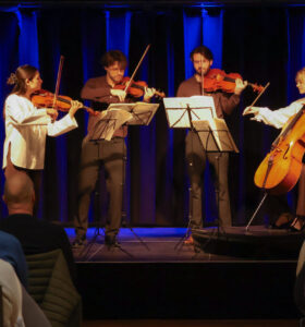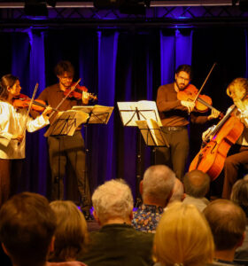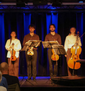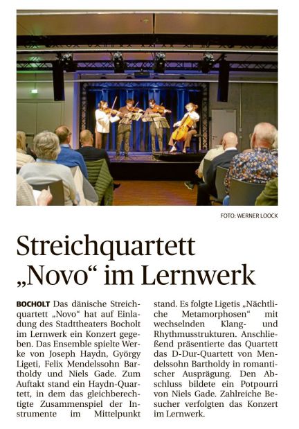 Als Beispiel par excellence war am Montag auf Einladung des Stadttheater Bocholt e.V. im LernWerk das „NOVO Quartet“ zu erleben. Die vier dänischen Musiker Kaya Kato Møller, Nikolai Nedergaard (Violine), Daniel Śledziński (Viola) und Signe Ebstrup Bitsch (Cello) präsentierten Joseph Haydns Streichquartett G-Dur in nuancen- und farbenreicher Leichtigkeit. In klanglich glasklarer Transparenz spielten sie wie auf einem Instrument, mühelos gelangen die filigranen Figurationen des Stückes.