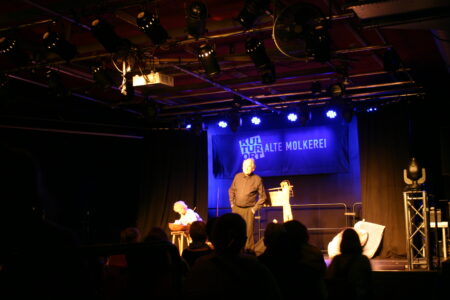 Das Lille Kartofler Figurentheater aus Langenfeld kam in die „Alte Molkerei“. Mit von der Partie war natürlich Rotkäppchen schon deswegen, weil das Stück so hieß. Zuerst traten aber Mutter und Großmutter auf. Letztere wollte rasch nach Hause und ins Bett, hielt sich aber trotzdem für kerngesund, was sogleich mit „Na, das wollen wir aber erstmal sehen!“ aus dem jungen Publikum quittiert wurde. Die Kinder begeisterten die Großen mit ihren spontanen Einwürfen, Fragen, Warnungen. Selbst ihre Assistenz auf der Bühne war vonnöten, weil Puppenspieler Matthias Kuchta alleine mit seinen Puppen im Leben nicht klar gekommen wäre. Schließlich gab es noch den eigentlich ganz netten Wolf, der aber trotzdem zur berüchtigten Freßorgie überging und so sein Leben verwirkte.